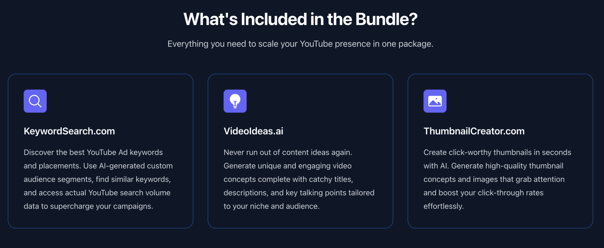 You Get a YEAR of KeywordSearch.com + ThumbnailCreator.com + VideoIdeas.ai